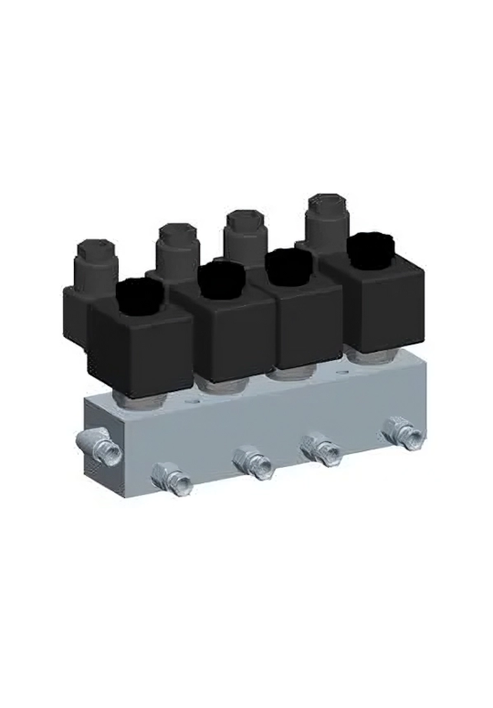 The Zone Valve is primarily used for oil applications. It is possible to have between 1 to 5 zones. Each zone or outlet is independently activated by 24 V DC solenoid coils.